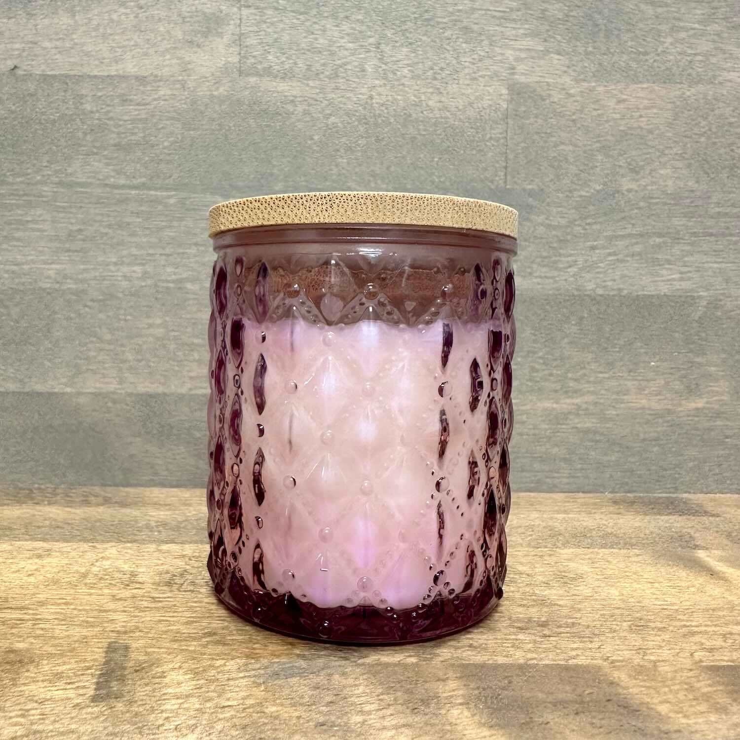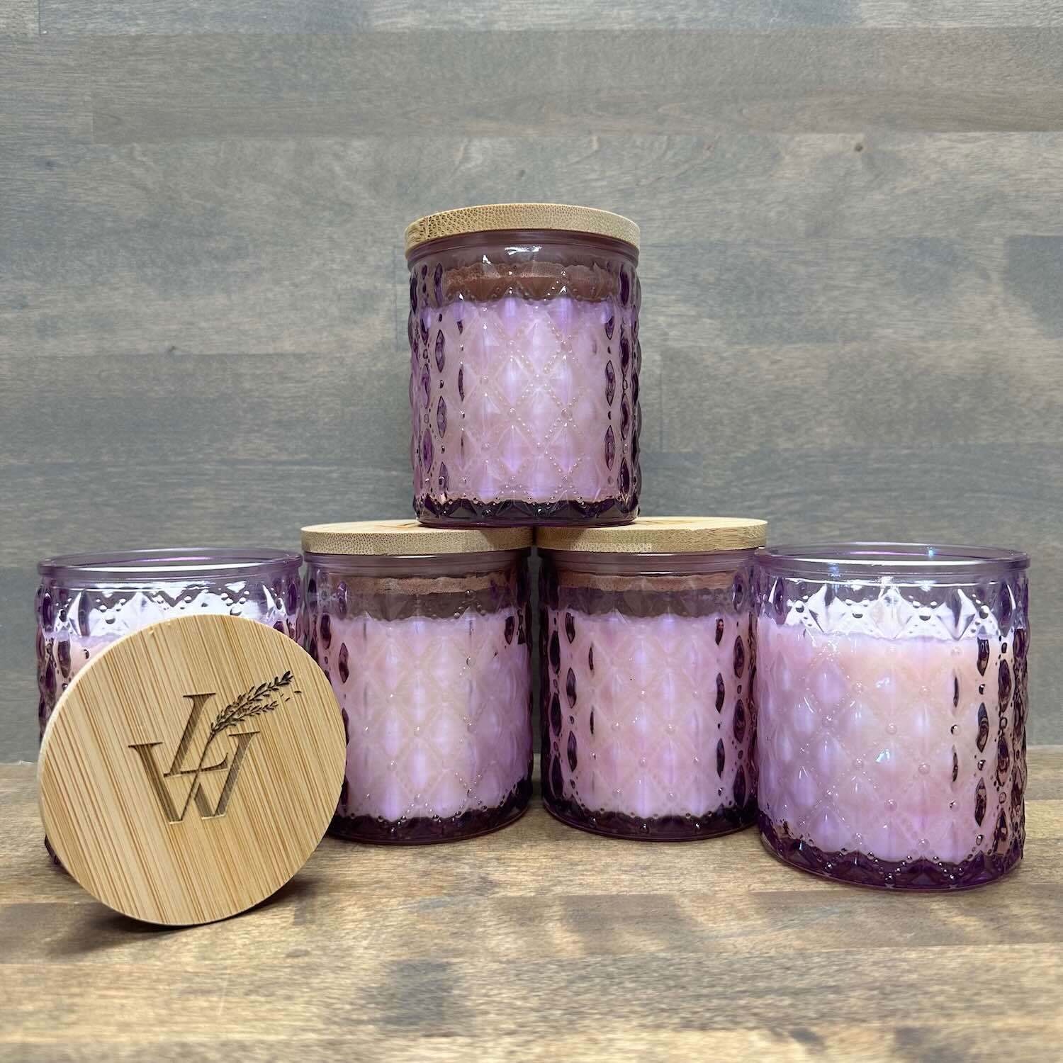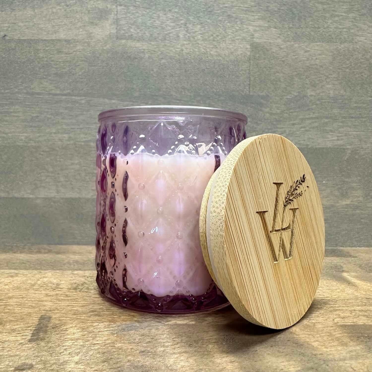 A lovely soy candle scented with pure lavender essential oil. Each candle comes in a pink glass jar with a bamboo top laser printed with our logo. The jars are re-usable after your candle has burned to the bottom.