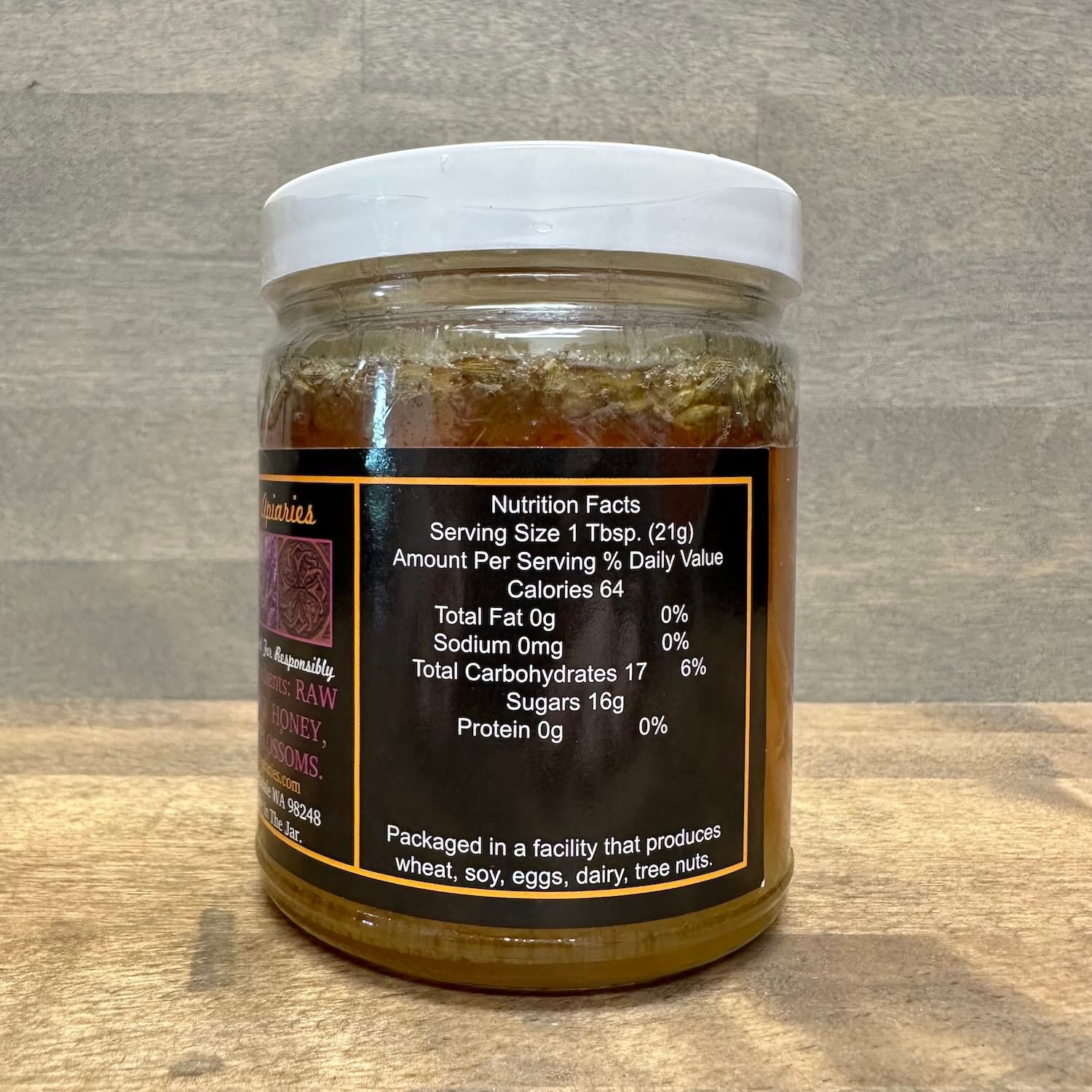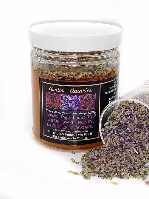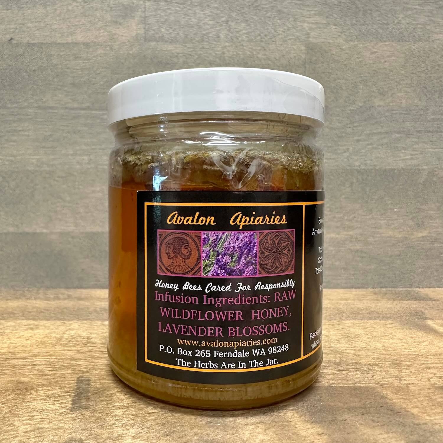 Raw Lavender Infused Wildflower Honey hand-produced from Avalon Apiaries harvested from honeybee hives in the forests and fields of North Western Washington.