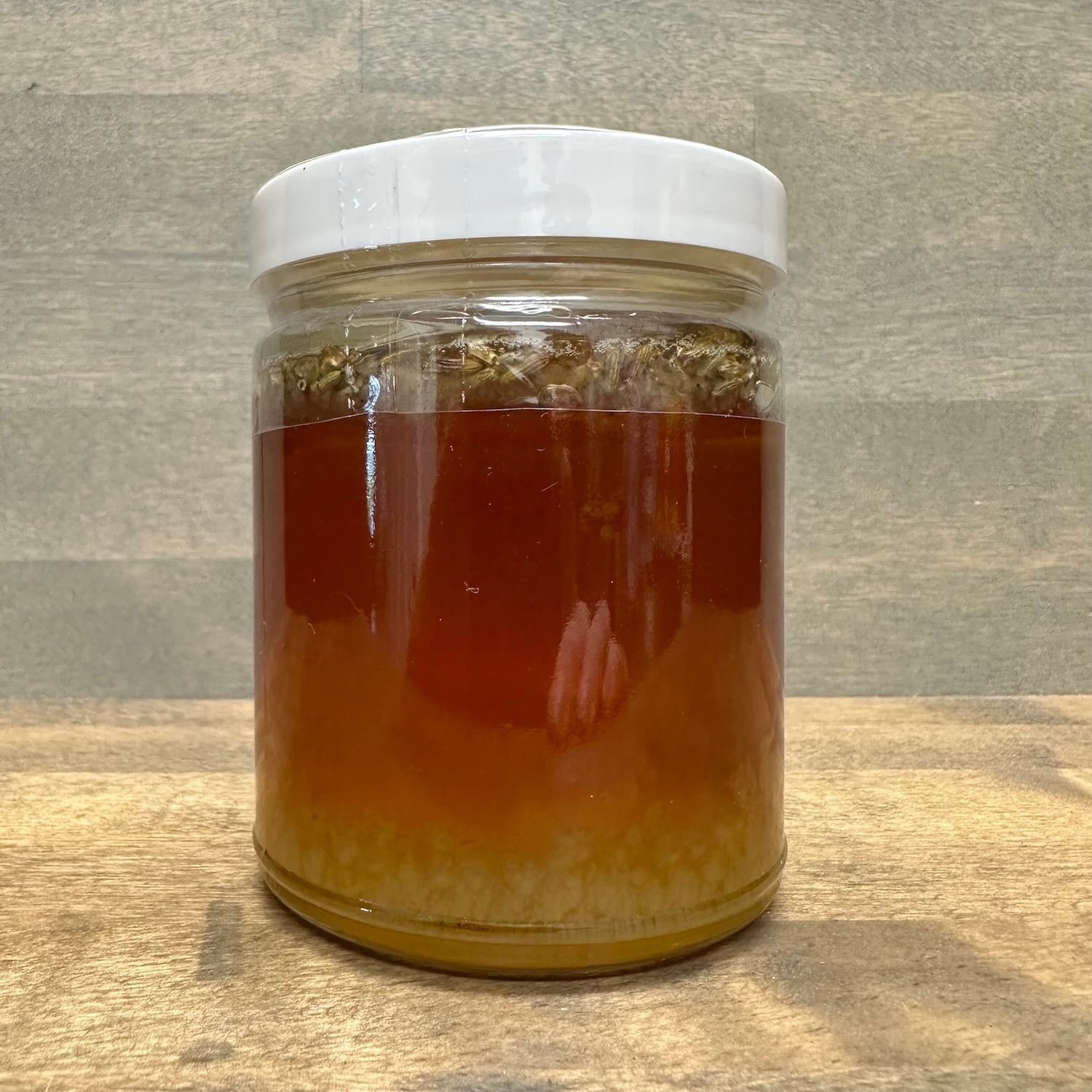 A 10 oz glass jar of Raw Lavender Infused Wildflower Honey from the forests and fields of North Western Washington. This honey is never pasteurized and minimally filtered with cheese cloth, so there can be bit of wax, propolis, and or pollen. Honey will naturally have seasonal variations in color and flavor, all delicious!
