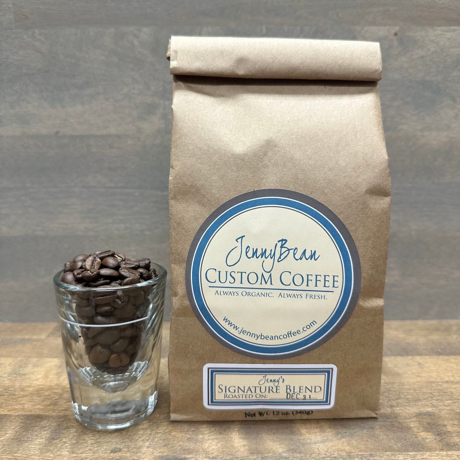 This Signature Blend is a staple from JennyBean Custom Coffee—a family-owned micro-coffee roaster nestled on beautiful Whidbey Island. This delicious blend is crafted from the finest certified organic Arabica beans and roasted in ultra-small one-pound batches to bring out signature notes, comforting aroma, and a smooth, balanced finish.