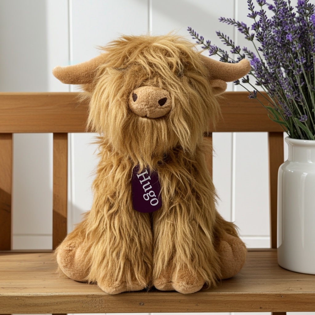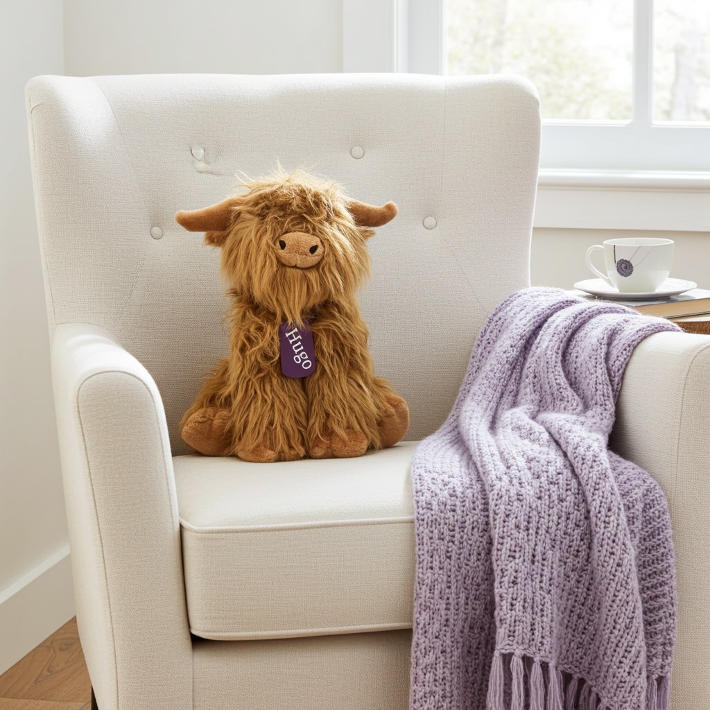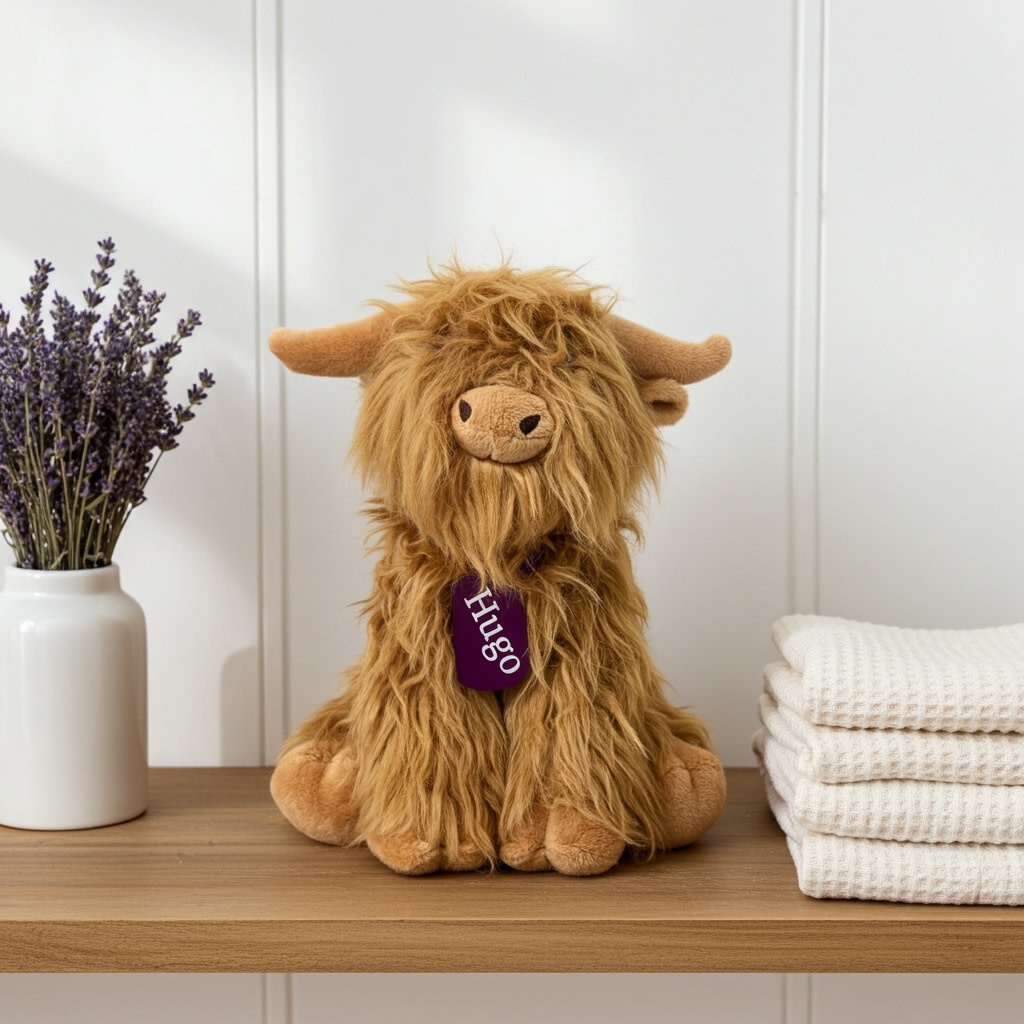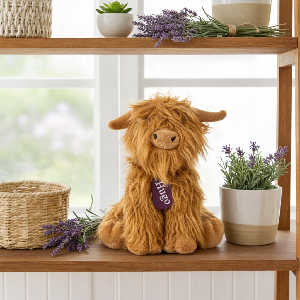 Meet Hugo, the 8-inch Lavender Stuffed Highland Cow: a cuddly, fragrant friend hand-filled with locally grown lavender buds to bring comfort, calm, and a dash of charm to your day.