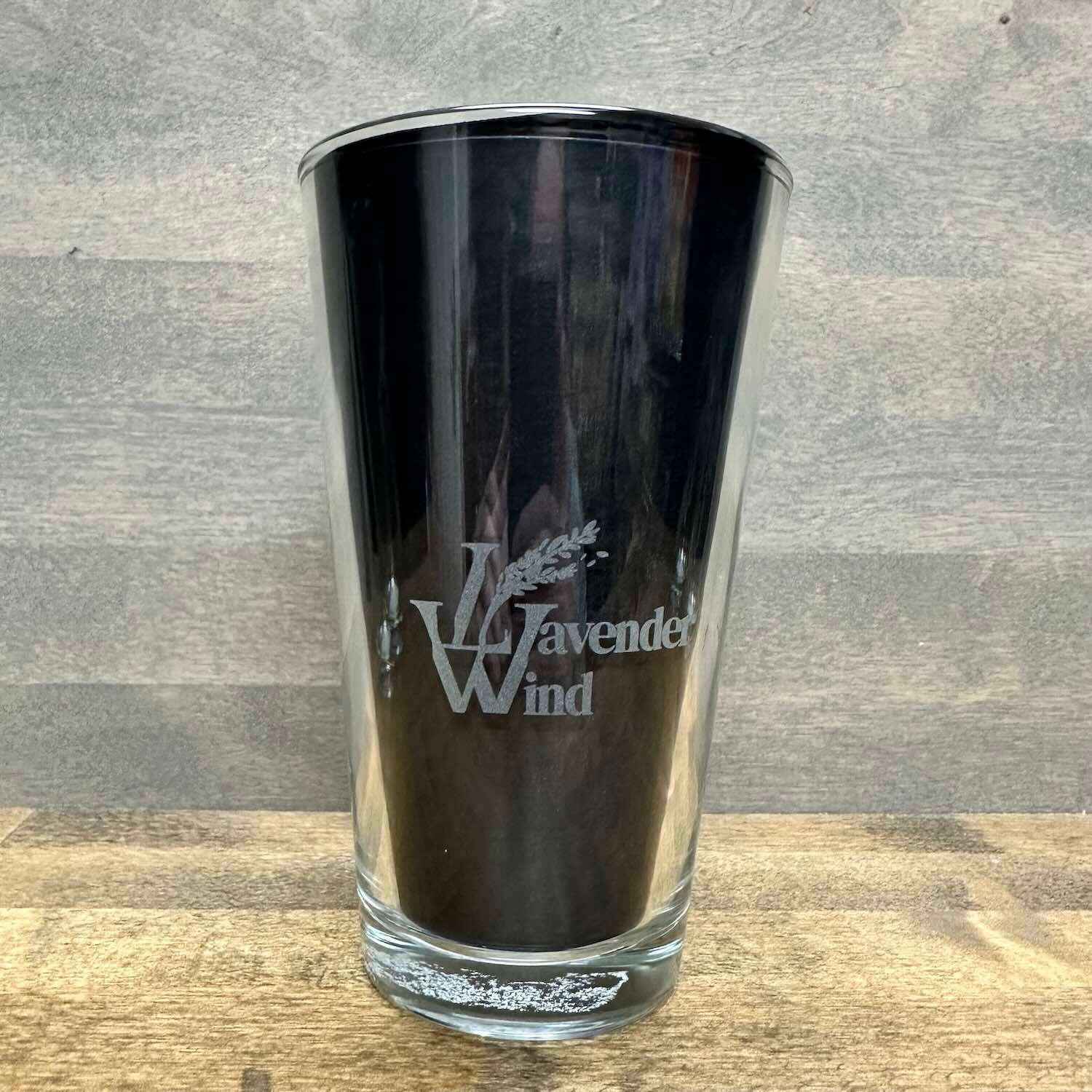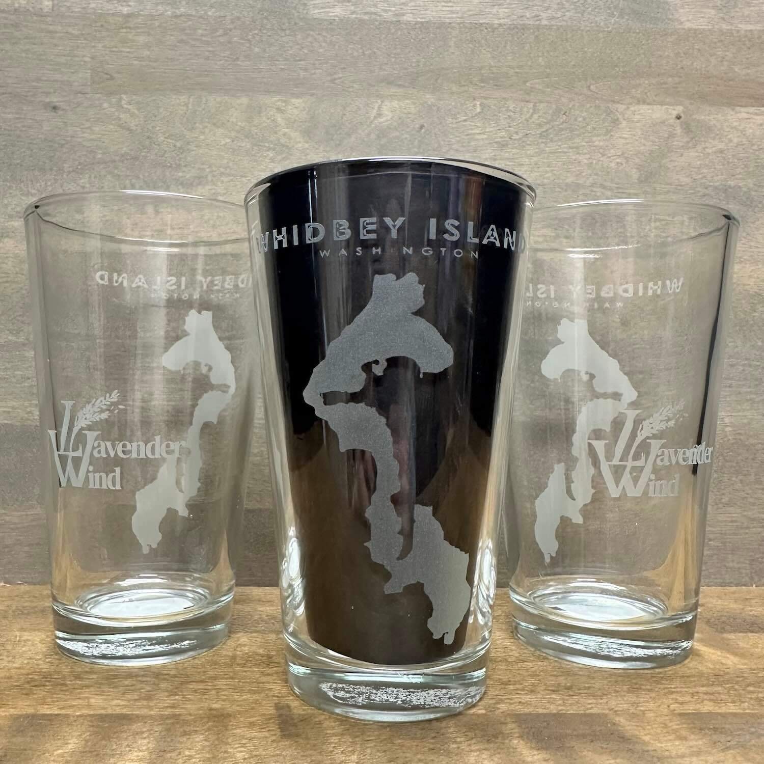 Laser-Etched Pint Glass – 16 oz clear glass etched with the outline of Whidbey Island on one side and Lavender Wind logo on the other. A durable, dishwasher-safe keepsake.